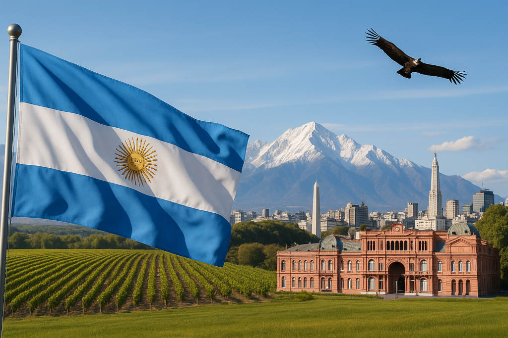 Argentinien Flagge weht im Vordergrund, im Hintergrund sind harmonisch die Anden, das Regierungsgebäude Casa Rosada in Buenos Aires und die Weinfelder von Mendoza am Horizont angeordnet – unter klarem, hellblauem Himmel als Symbol für Natur, Geschichte und Identität Argentiniens.