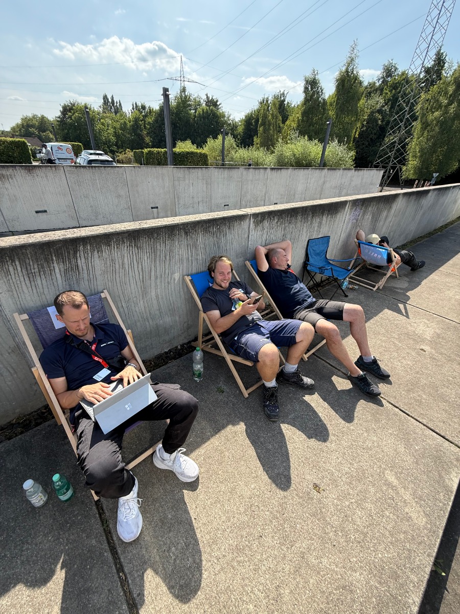 Mit elf Sprintern und drei PKWs, die bis unter das Dach beladen waren, machten wir uns schließlich auf den Weg. Von Essen aus ging es Tag für Tag in eine neue Stadt. Morgens aufbauen, teilweise bei Regen oder in der prallen Sonne, dann die Rennatmosphäre genießen. Wenn das Rennen gelaufen war und die Fahrer sich schon in ihre Hotels zurückgezogen hatten, hieß es für uns: abbauen, einladen und weiterfahren.