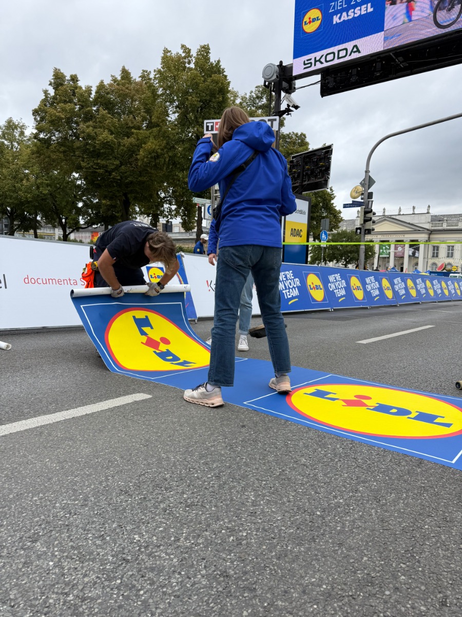 Dabei ist die Platzierung eines jeden Werbeträgers strategisch geplant und es fließen viele Gedanken in die Konzeption ein. Es geht darum, wo eine Fahne im Kamerabild steht oder welche Botschaft die Zuschauer bei der Zieleinfahrt sehen. Diese und weitere Fragen stellen wir uns bei jedem Event aufs Neue und suchen nach der optimalen Lösung für maximale Sichtbarkeit.