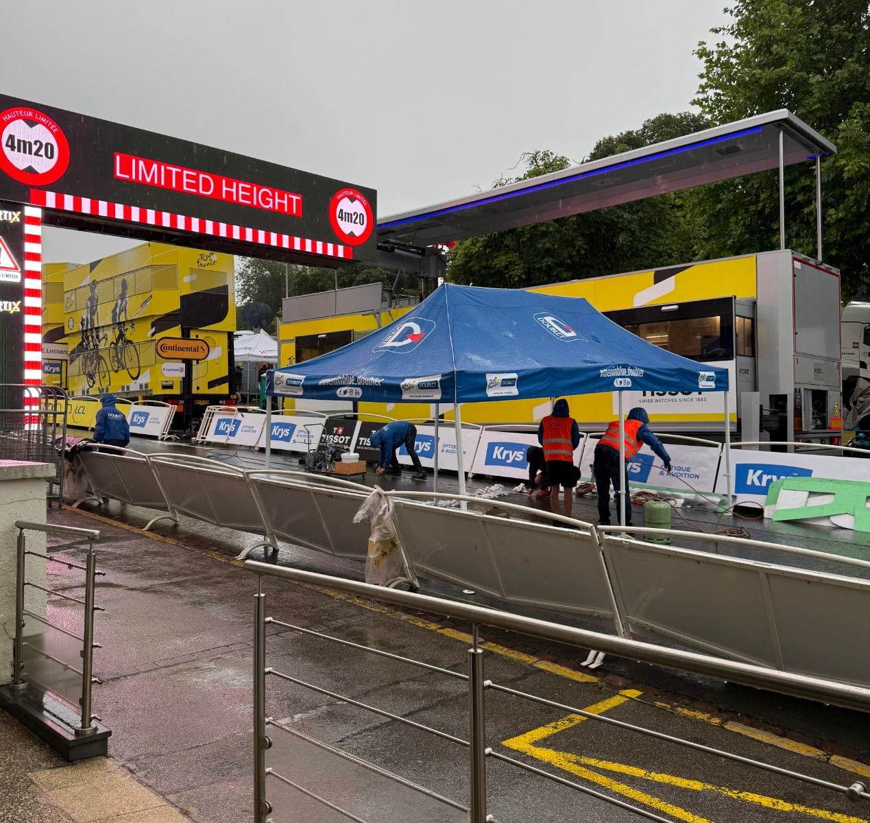 Am Sonntag, den 6. Juli, war es so weit. Frühmorgens um 7 Uhr trafen wir in Boulogne-sur-Mer ein, um den Aufbau der Zielgeraden zu begleiten. Schon beim ersten Blick war klar, dass das Team von Doublet super eingespielt war. Jede Bewegung saß, die Materialien waren alle perfekt organisiert, der Aufbau erfolgte zügig und präzise.