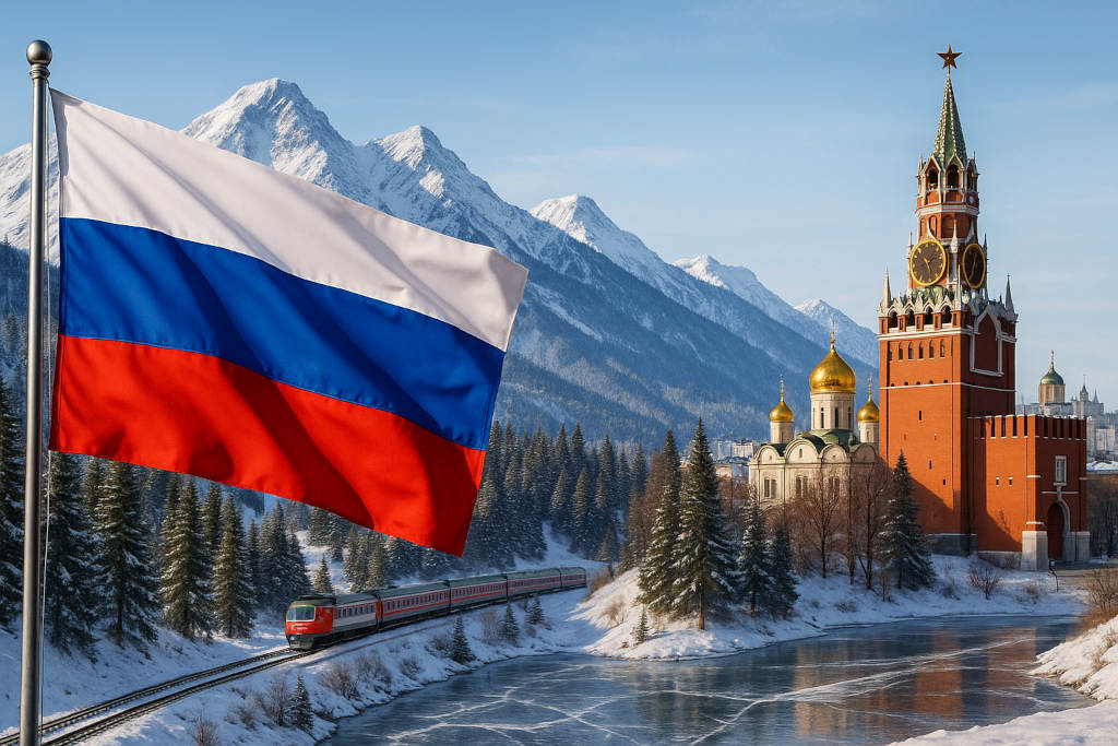 Russische Flagge im Vordergrund vor verschneiten Bergen mit Tannenwald, Transsibirischem Express und dem Kreml mit goldenen Kuppeln und Spasskaja-Turm im Hintergrund.