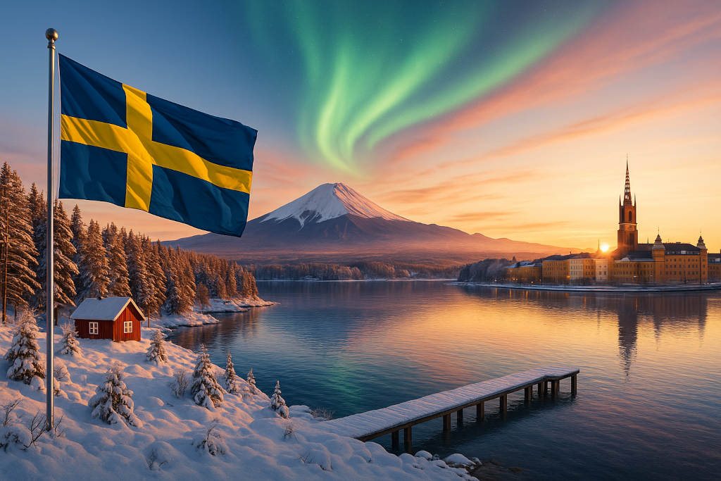 Die Nationalflagge von Schweden weht vor winterlicher Naturkulisse: links verschneite Kiefernwälder mit roter Holzhütte, mittig ein gefrorener See mit Holzsteg und dezentem Nordlicht, rechts die moderne Skyline von Stockholm mit Rathausturm – eingefangen im goldenen Morgenlicht.