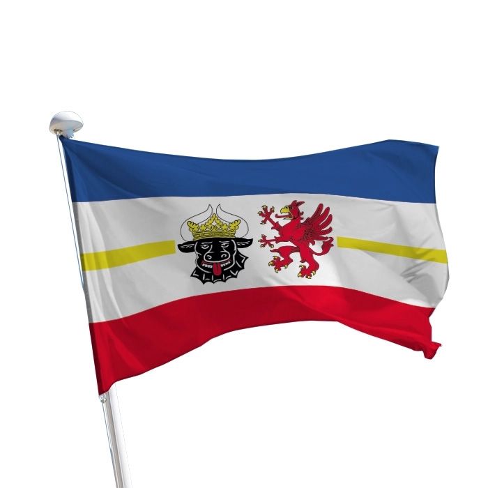 Das Wappen der Mecklenburg-Vorpommern Flagge zeigt zwei historische Wappentiere: den schwarzen Stierkopf für Mecklenburg und den roten Greif für Vorpommern. Beide Symbole stehen für die historischen Landesteile des Bundeslandes und verdeutlichen die gemeinsame Geschichte und Identität Mecklenburg-Vorpommerns.
